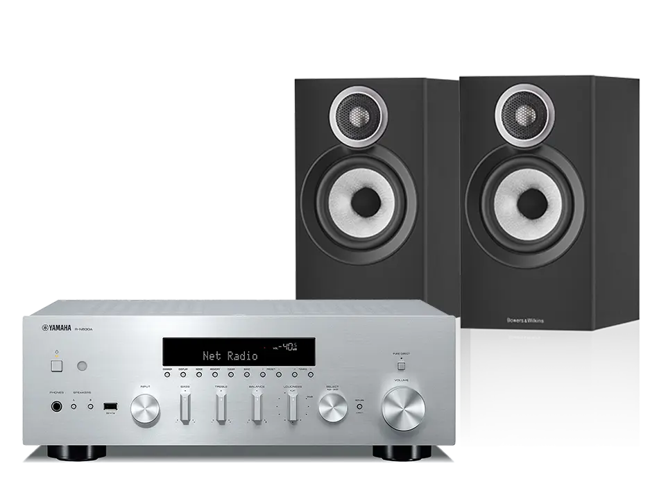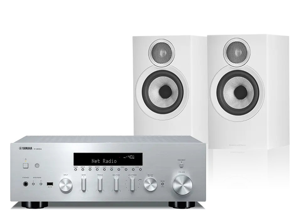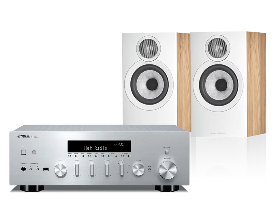 סט מגבר סטריאו משולב עם נגן מוזיקה וזוג רמקול מדף איכותי המייצרים חוויית האזנה מרגשת ורחבה.