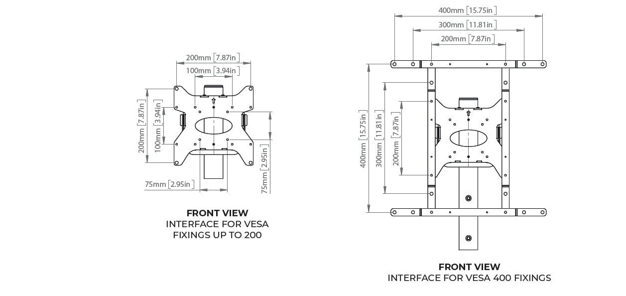 התאמה למסכים עם תאום ל- VESA 75, VESA 100, VESA 200, VESA 300 ו-VESA 400 במשקל מרבי של 25 ק"ג.