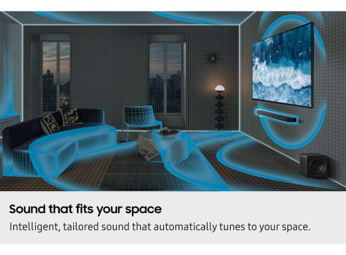 מקרן קול Samsung HWQ800F 5.1.2ch Dolby Atmos אלחוטי כולל סאב וופר אלחוטי הוא מערכת אידיאלית לבתים מודרניים, המציעה צליל קולנועי סוחף של Dolby Atmos, תכונות אדפטיביות חכמות, אינטגרציה חלקה של בית חכם ויכולת הרחבה, הכל עטוף בחבילה קומפקטית ומסוגננת והכל ללא כבלים מיותרים.